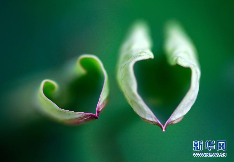 这是5月15日在位于淮河下游的江苏省淮安市盱眙县拍摄的荷叶嫩叶。初夏时节,沿淮水系中的荷叶嫩叶竞相萌发。微距镜头下的嫩叶宛如“心”形,含“笑”而立。 新华社发(周海军 摄)