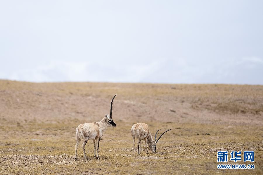 5月16日,两只藏羚羊在可可西里地区活动。新华社记者 吴刚 摄