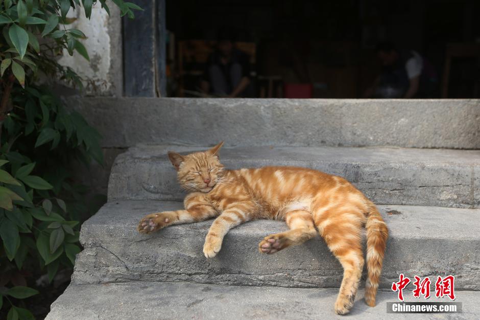 图为古村内的一只猫懒洋洋的晒着太阳。 中新社发 泱波 摄