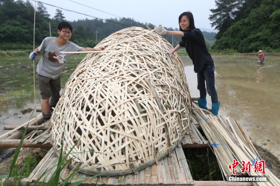 5月25日,东南大学大学生为即将完工的鸭寮(鸭子住的棚子)做最后的收尾。从5月15日开始,30多位来自南京东南大学建筑学院的大学生们走进浙江临安太阳公社,携带设计好的竹材模型,用真实的竹子材料在稻田内搭建鸭寮,以实用为基础,将小小的鸭鹏建造的极具创意和想象力,为朴素的农田增添了一道独特的风景。中新社发 泱波 摄