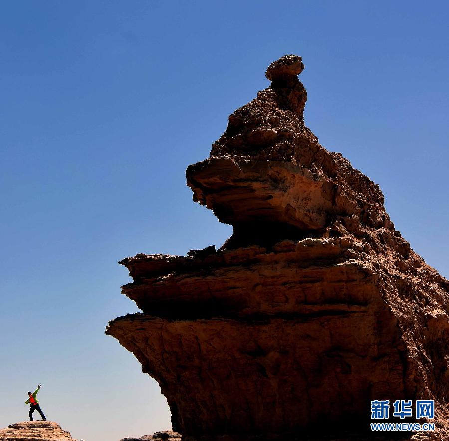 在敦煌雅丹国家地质公园内,一位游客在一处塔状雅丹地貌旁摆出造型拍照留念(5月24日摄)。