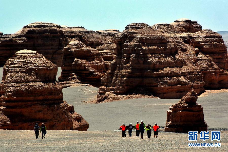 一群游客走出敦煌雅丹国家地质公园内的一处雅丹地貌集中区域(5月24日摄)。