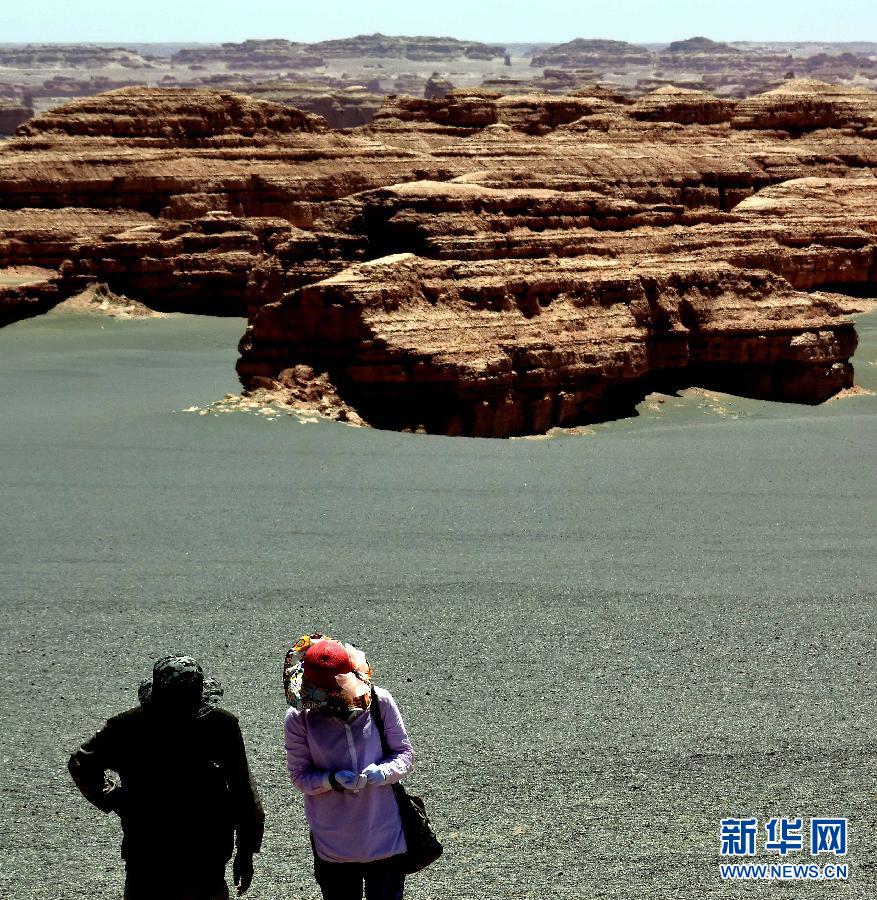 在敦煌雅丹国家地质公园内,两位游客走出一片垄状雅丹地貌集中区域(5月24日摄)。