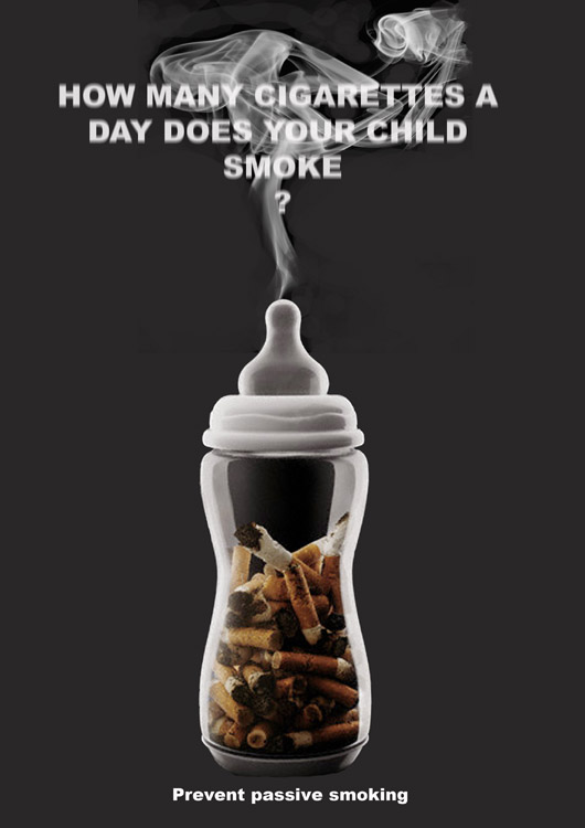 英国伦敦大学学院的研究人员曾发表论文说,女性吸烟会使孩子出生时出现颅骨缺损的风险增加33%,畸形足的风险增加28%,腭裂的风险增加28%,肢体缺失或畸形的风险增加26%,心脏缺陷的风险增加10%。广告标语:你的孩子每天吸多少根烟?