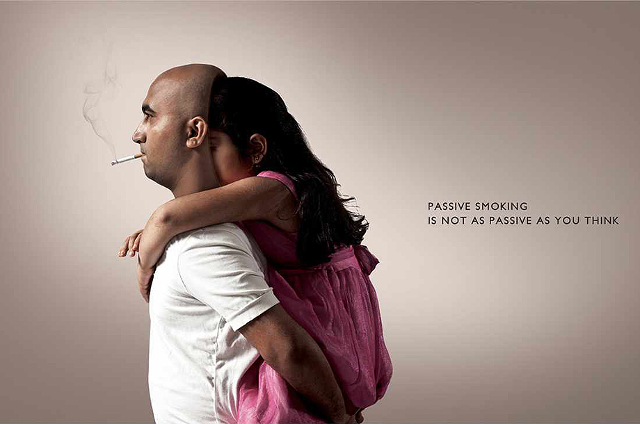 美国加州大学旧金山分校的一项研究称,每年有超过4.2万名从不吸烟的美国人因受“二手烟”危害而死亡。广告标语写着:“被动吸烟”并不像你想象中的那样被动。
