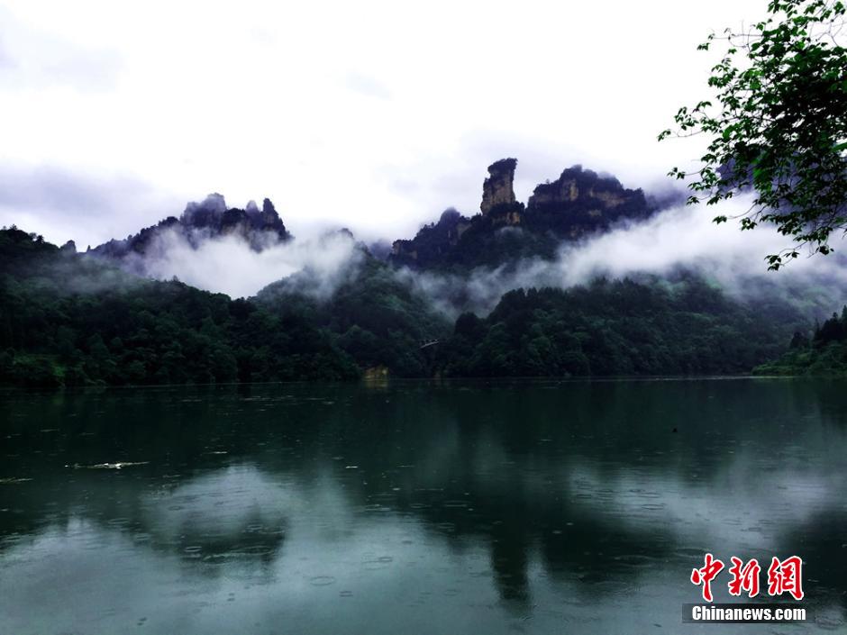 6月2日,世界自然遗产地张家界武陵源景区大雨如注。连绵峰林间出现忽隐忽现、飘渺梦幻般的雨雾美景,吸引众多游客拍照留念。吴勇兵 摄