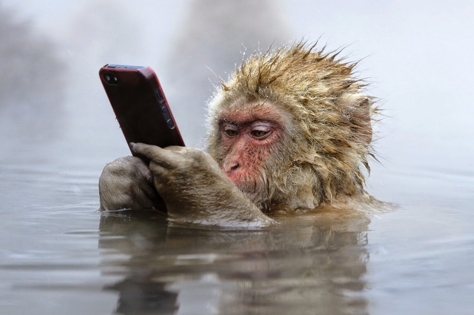 据日本《产经新闻》2014年10月报道,在伦敦的自然历史博物馆举办“2014年野生动物摄影师”大赛中,一只雪猴在长野县山之内町的“地域谷野猴园”边泡温泉边玩iPhone手机的照片获得特等奖。游客用iPhone靠近猴子拍照,有时猴子会抢走他们的手机,并自己按下快门。