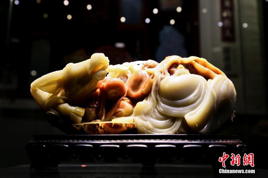 图为中国工艺美术大师陈文斌创作雕刻的寿山石李红善伯《曲水流觞》。李南轩 摄