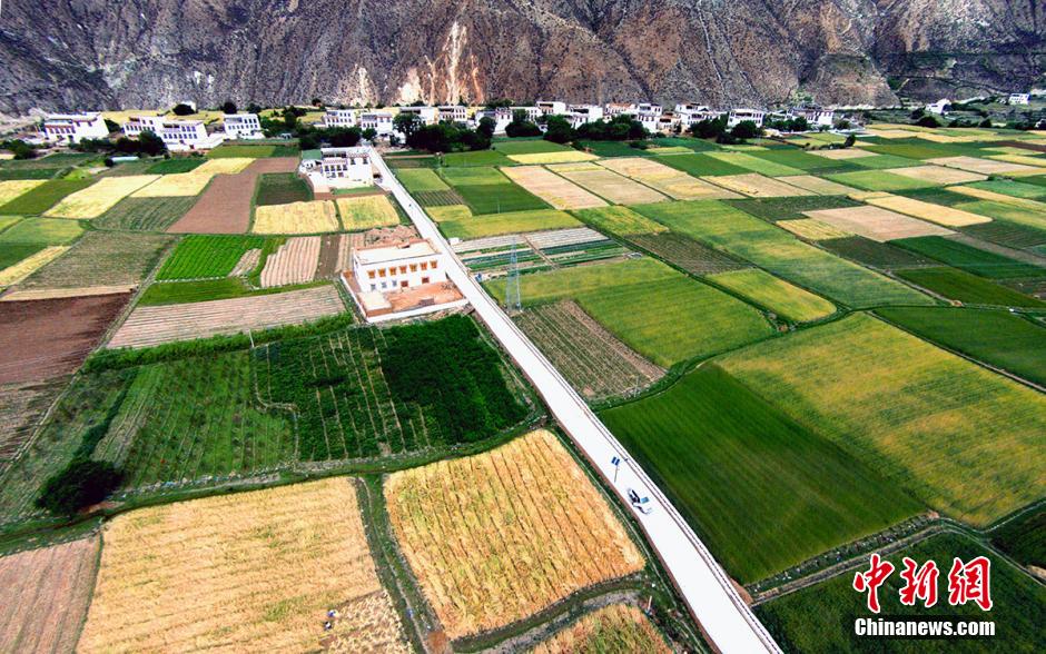 白藏房的颜色也有一段动人的传说。据说巴姆仙女看到她所毗邻的土地上,藏式民居灰头土脸,外观陈旧,便灵机一动,洒下自己的化妆品,结果藏房一下就变白了,随着白色藏房的出现,乡城山水突然明朗了许多。当地藏族同胞在房屋建成后,用乡城山上特有的阿嘎土拌水搅成白色土浆,盛于器具里内,从墙头慢慢浇下,直到墙变白。图为绿色、白藏房、黄色等构成一幅画卷。刘忠俊 摄