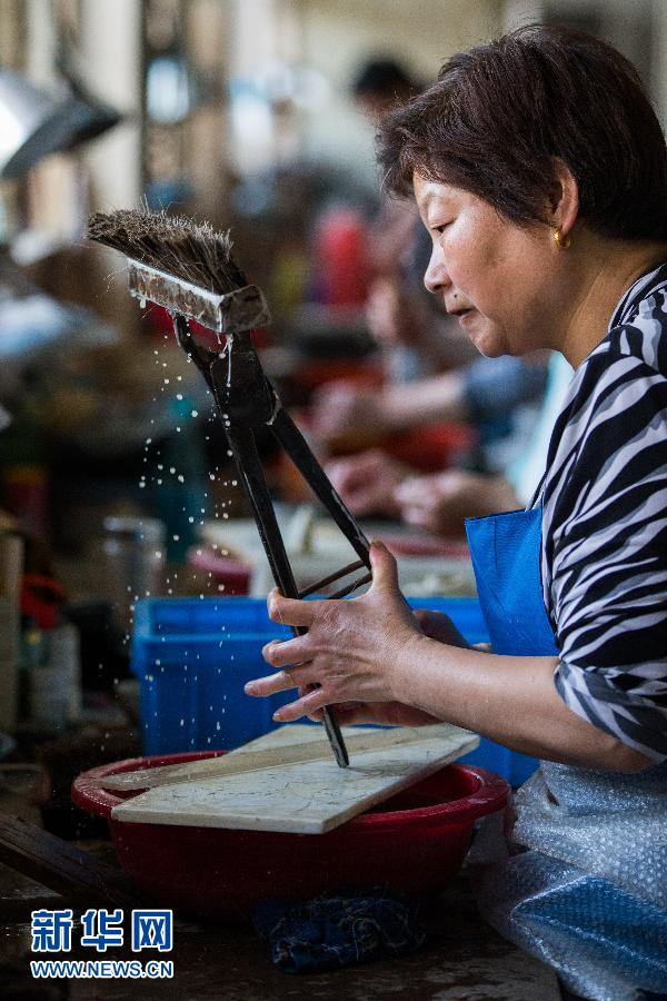 6月11日,江苏省扬州市江都国画笔厂的毛笔制作师用传统手工方法制作毛笔。毛笔是中国传统书写工具,已经有上千年的历史。扬州毛笔制作技艺独树一帜,取材天然,工艺复杂,全凭手感、舌感和目测制作,有均、齐、理、扎、装、择等120多道工序。2010年,扬州毛笔制作技艺入选第三批国家级非物质文化遗产名录。新华社发(郁兴 摄)