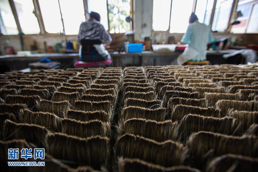6月11日,江苏省扬州市江都国画笔厂的毛笔制作师用传统手工方法制作毛笔。毛笔是中国传统书写工具,已经有上千年的历史。扬州毛笔制作技艺独树一帜,取材天然,工艺复杂,全凭手感、舌感和目测制作,有均、齐、理、扎、装、择等120多道工序。2010年,扬州毛笔制作技艺入选第三批国家级非物质文化遗产名录。新华社发(郁兴 摄)