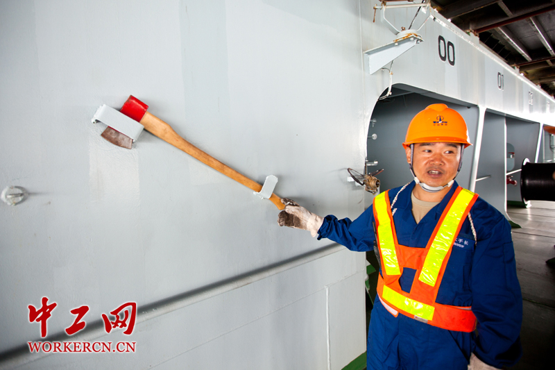 水头说:“看似平常的工作,也可能有危险。一旦出现意外,就需要用消防斧来砍断缆绳。”其实,消防斧的作用不仅局限于此,甚至可以用来对付海盗。电影《泰坦尼克号》中,Rose也是用一把这样的消防斧砍断了Jack的手铐。 中工网记者 李雪峰摄