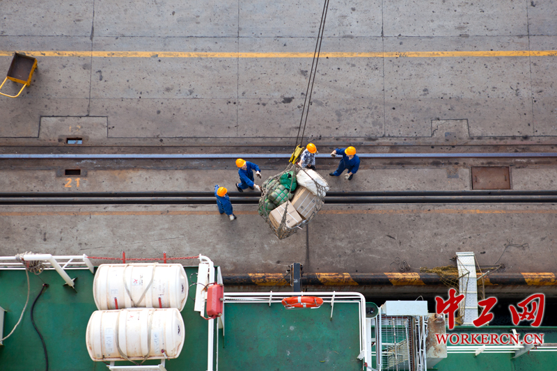 几名船员在岸上协助水头吊起货物。一般是一些日用消耗品、物料等。 中工网记者 李雪峰摄