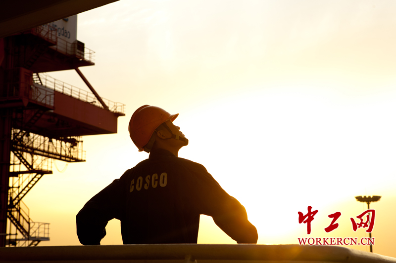刘雷是船上的实习水手,也是水头的徒弟。他今年只有21岁,中远圣保罗轮是他登上的第一条船,出海仅仅4个月。水头在上面操纵吊车时,他站在下面静静地观察师傅的一举一动。 中工网记者 李雪峰摄