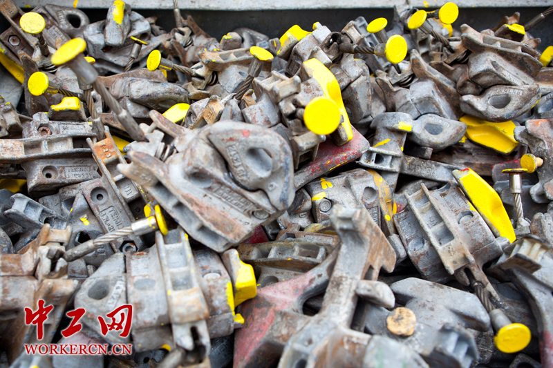 刚刚刷过油漆的集装箱锁脚,高高摞起的集装箱就是靠它们固定住的。 中工网记者 李雪峰摄