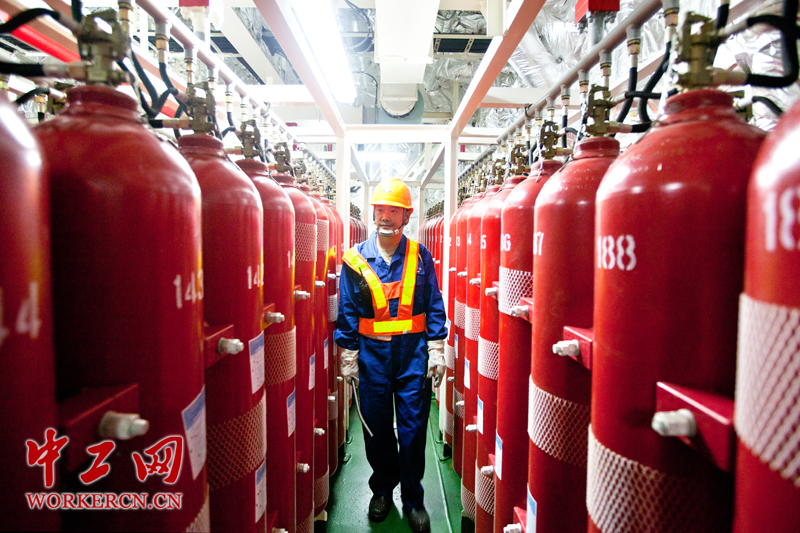 为防止偷渡,每次船舶离港之前,船上的每个角落都要仔细检查。图为水头在检查二氧化碳间。   中工网记者 李雪峰摄