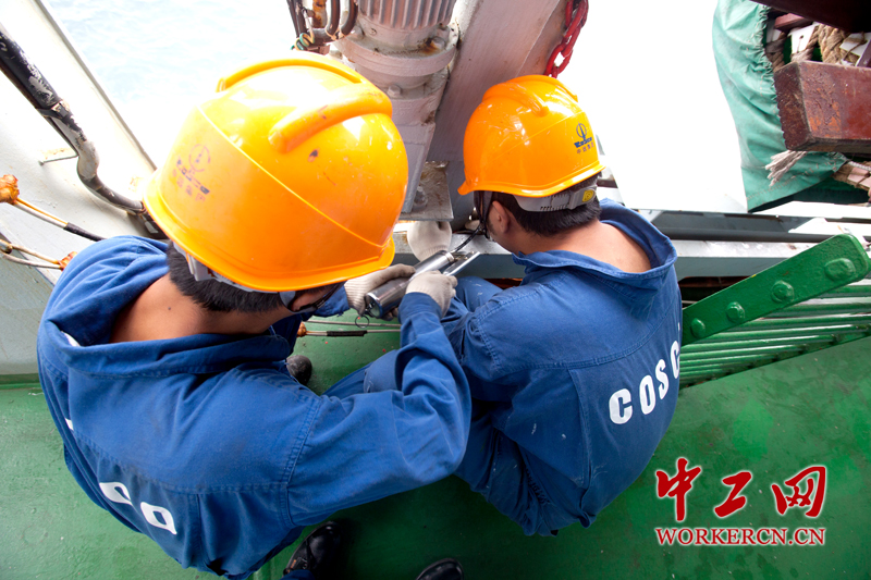 木匠和同伴为旋梯上油。 中工网记者 李雪峰摄