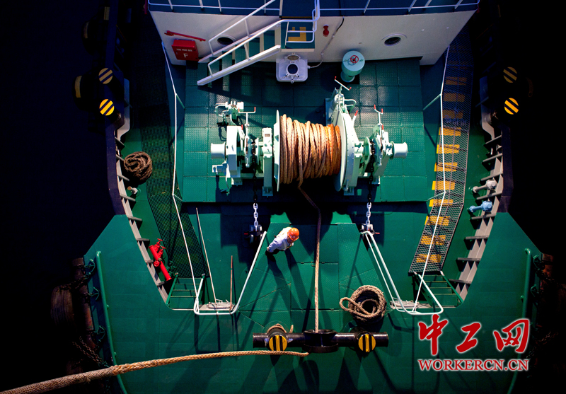 离港船舶都需要长长的缆绳连接拖轮,以便调转方向。而木匠就需要根据情况调节缆绳的松紧程度。 中工网记者 李雪峰摄