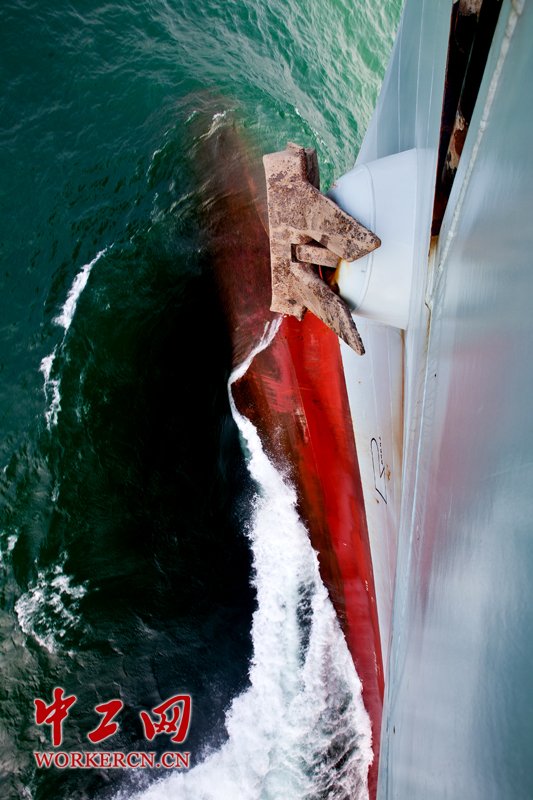 这个不起眼的“铁疙瘩”就是“锚”,可它却达9吨多重。平时一左一右挂在船头,遇到特殊情况时,巨大的锚爪便会深入水中,牢牢抓住海底淤泥,保持船舶的稳定性。 中工网记者 李雪峰摄