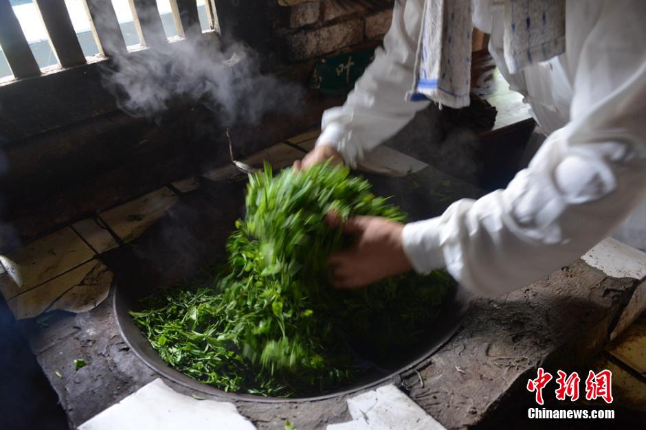 6月24日,四川省名山县蒙顶山下圣香玉叶制茶坊炊烟袅袅,经过制茶师刘绪敏的杀青、反复揉捻和柴火炒制、烘培等工序,数小时后,色香味俱全的茶叶便一一出炉。随着时代变迁,这项有着上千年历史的手工制茶工序逐渐退出历史舞台,被现代工业化生产所代替。这里也成为当地仅有的纯手工制茶坊。相比现代化的制茶工序,纯手工炒制的茶叶在生产过程中无任何化学污染,其手感柔和,滋味醇厚,色泽翠嫩,保持了茶叶原有的天然风味,深受茶客喜爱。张浪 摄