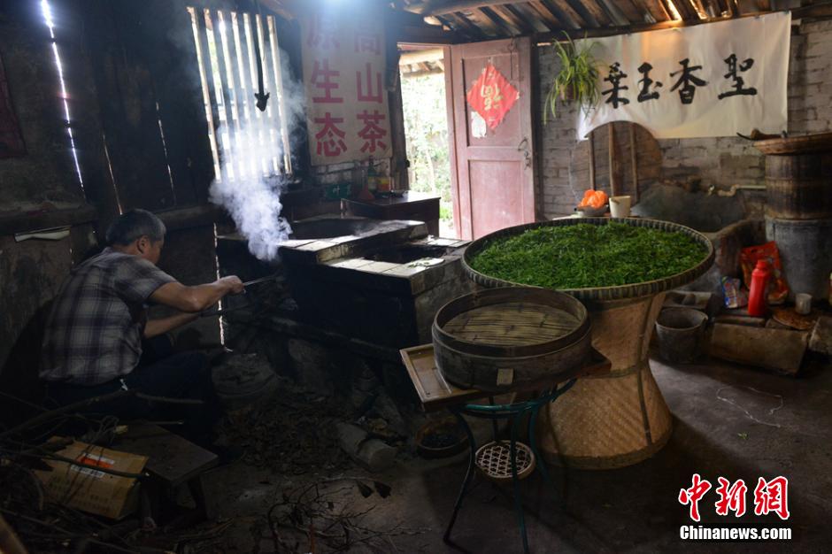炒茶之前,刘绪敏父亲用柴火将铁锅烧热到适宜温度。
