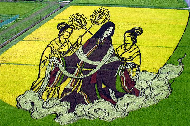 位于青森县田舍馆村也是日本稻田画的溯源地。为振兴当地经济,开发观光资源,1993年该村村民开始制作稻田画。每年题材都不同,题材涉及日本内外,非常广泛,既有日本著名的古代武将雄姿,也有蒙娜丽莎、拿破仑,甚至还有哆啦A梦这样的动漫形象