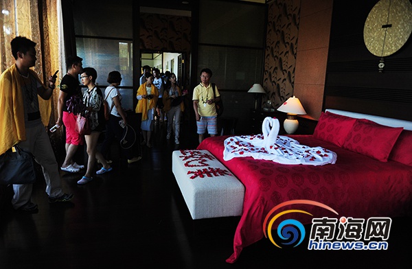 6月27日,“一带一路看海南”全国重点网络海南行记者团参观石梅湾艾美度假酒店总统套房的主卧。(南海网记者沙晓峰 摄)