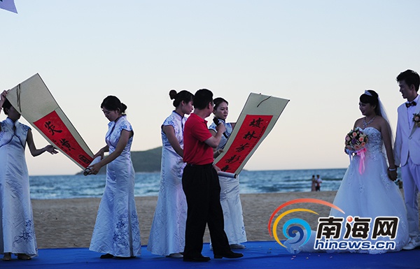 6月27日,万宁市委书记张美文向新人赠送自己创作的对联。(南海网记者沙晓峰摄)