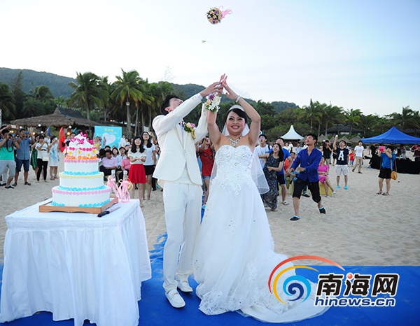 6月27日,婚礼现场新人抛绣球,将幸福传递下去。(南海网记者沙晓峰摄)