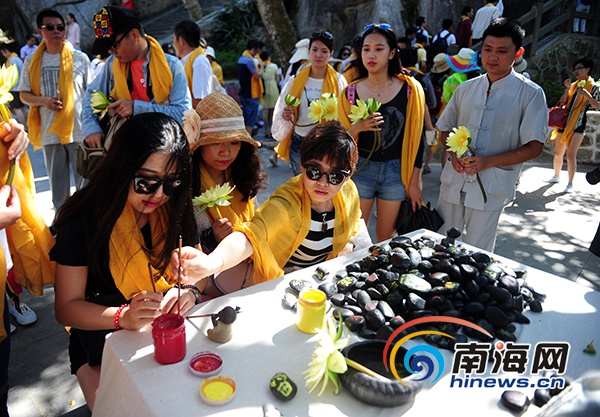 6月27日,网媒行的记者在东山岭的许愿石上写下自己的名字。(南海网记者沙晓峰摄)