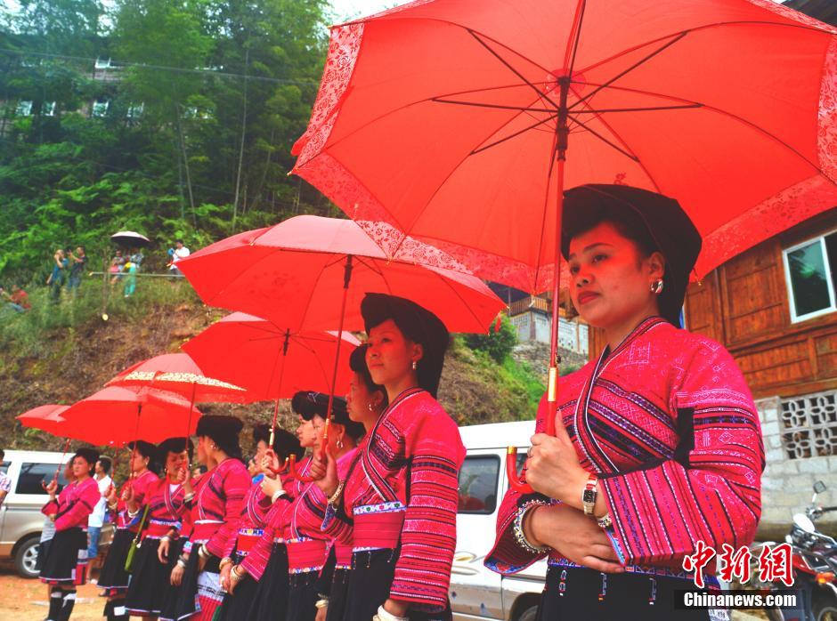 6月29日,广西桂林市龙胜各族自治县泗水乡迎来一年一度的传统“红衣节”,来自金坑、白面、孟山、细门等周边村寨的千余名红瑶群众会集潘内村,载歌载舞欢度“红衣节”。活动当天,民族歌舞盛宴、瑶家打旗工、红瑶刺绣大比拼、包粽子竞赛、水竹打糍粑、山歌擂台赛等原生态民俗活动吸引了众多中外游客和群众前来观赏体验。图为身着喜庆瑶族服装的迎客队伍。中新社发 潘志祥 摄