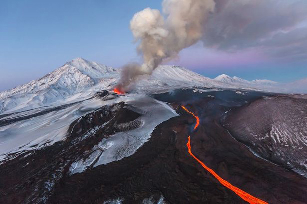 俄罗斯克柳雪夫斯卡亚火山散发出橘黄色光芒。(网页截图)