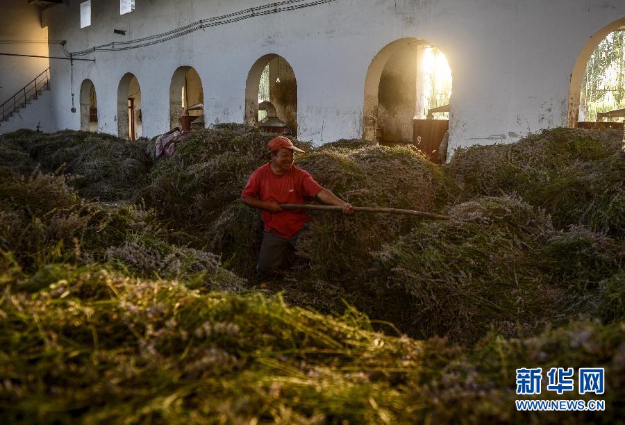 7月16日傍晚时分,一车车刚收割的薰衣草被送到厂房,这些薰衣草将在李广瑞双手的“呵护”下变成一滴滴精油。 新华社记者 赵戈 摄