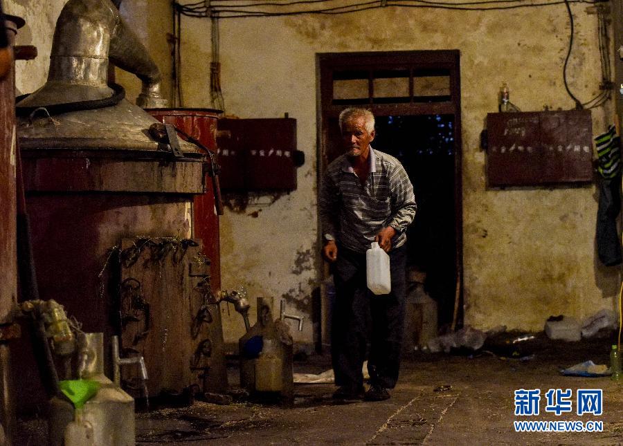 7月16日,天色暗了下来,李广瑞拿着白色塑料壶走向蒸锅。这个时候他是最紧张的,因为精油的多少直接关系到今年的收入。 新华社记者 赵戈 摄