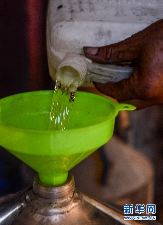 7月16日,李广瑞将熬制的精油倒入盛器内,这些精油还要经过深加工才能最终与消费者见面。 新华社记者 赵戈 摄