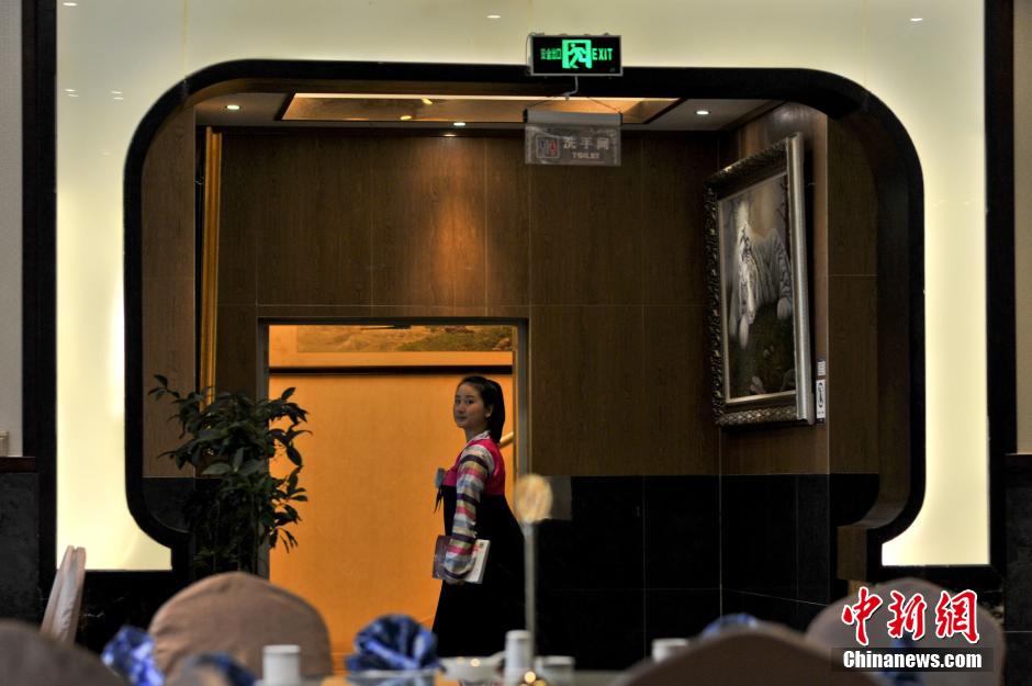 图为餐厅里的朝鲜服务员。 中新社发 任东 摄