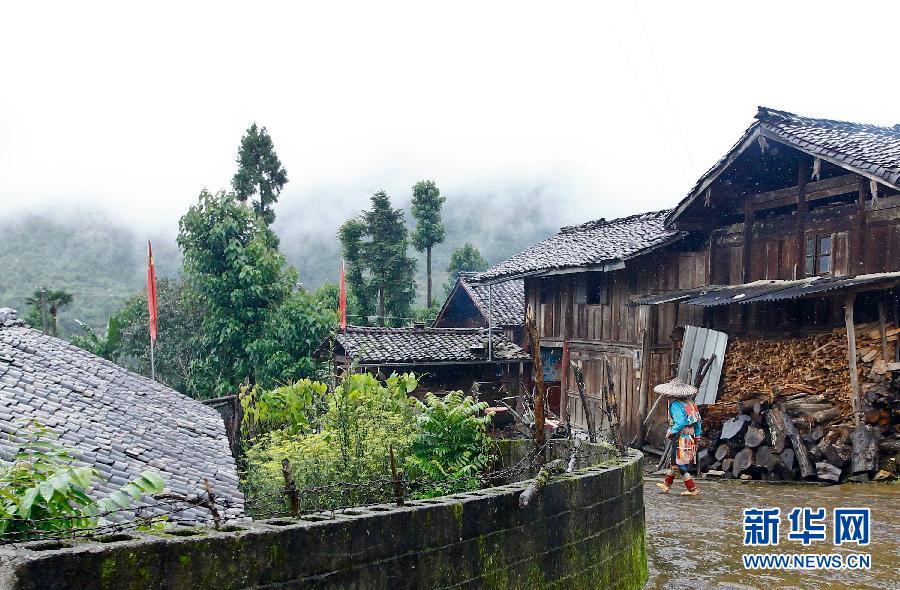 一位傈僳族村民行走在雨中的村寨小路上(7月23日摄)。