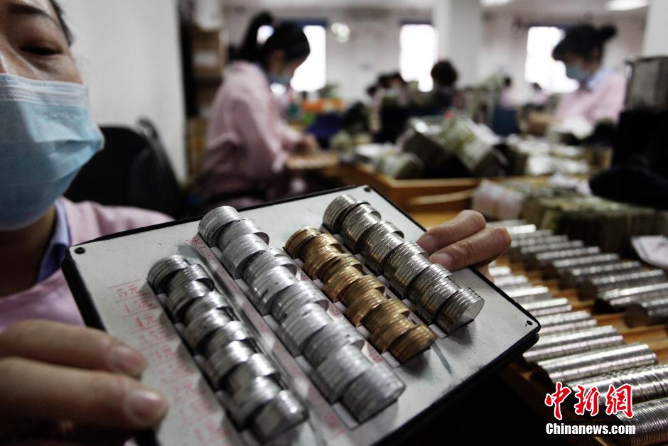 图为每种不同的硬币要用量尺量好后才能打包。李风 摄
