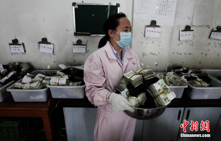 图为专门负责搬运的工人每天要搬运数吨零钱。李风 摄