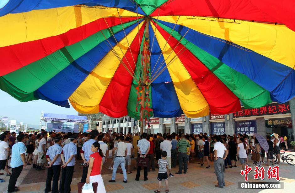 8月3日,江西省星子县一把高18米、直径23米的晴雨伞经吉尼斯总部工作人员现场认证,创造了吉尼斯世界纪录并获得吉尼斯世界记录证书,成为迄今为止世界上最大的晴雨伞。据了解,这把安装在星子县城勤德文化广场的巨伞是由当地一家制伞企业投资70万元设计生产的,总共历时半年时间制作完成。晴雨伞高18米、直径23米,重5.7吨,具有全自动伸收功能,可以抵抗九级大风,完全伸开需耗时14分钟左右,可遮挡面积达418平方米。魏东升 摄