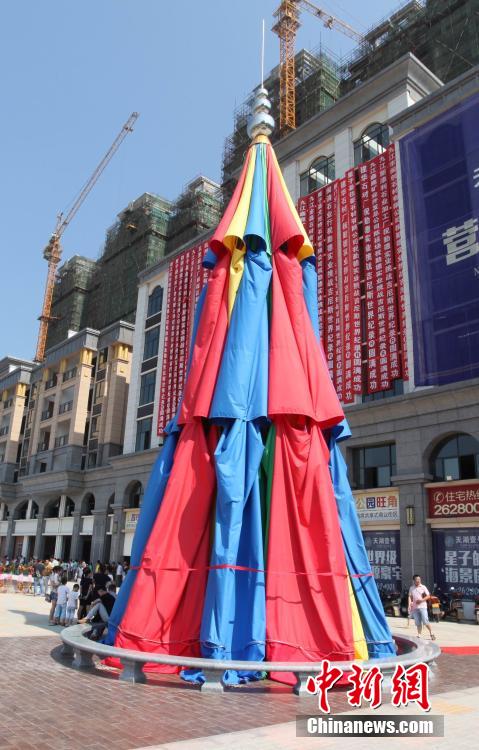 图为世界上最大的晴雨伞展开前。魏东升 摄