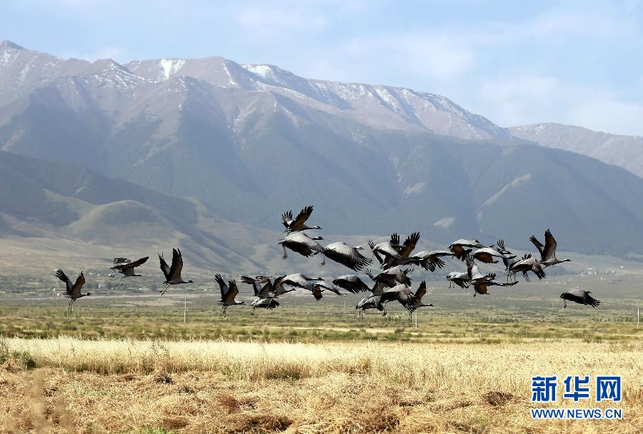 8月24日,蓑羽鹤飞翔在新疆哈密巴里坤哈萨克自治县草原上。位于新疆哈密地区的巴里坤草原具有得天独厚的生态资源,雪山与草原风光相映成景。 新华社发(周海军 摄)