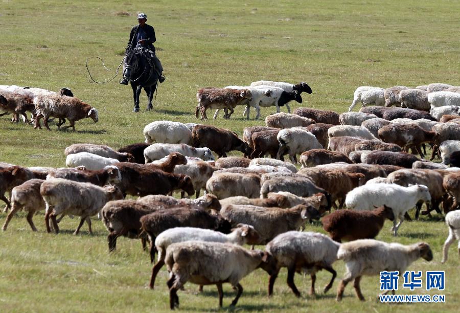8月24日,牧民在新疆哈密巴里坤哈萨克自治县草原上放牧。位于新疆哈密地区的巴里坤草原具有得天独厚的生态资源,雪山与草原风光相映成景。 新华社发(周海军 摄)