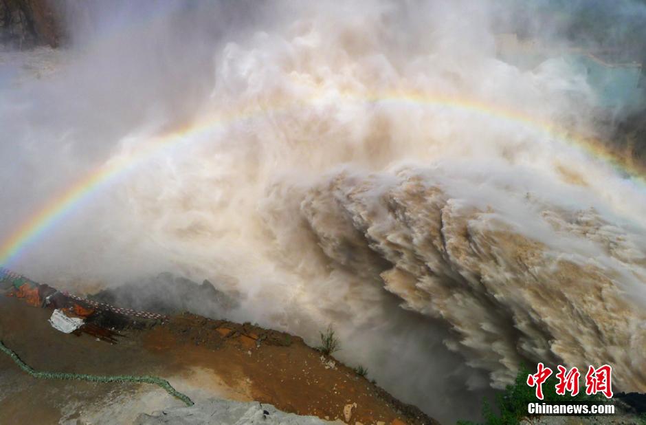 9月6日,黄河刘家峡洮河口排沙洞水下岩塞爆破成功,夹裹着大量泥沙的水流从排沙洞出口喷涌而出,形成壮观的“黄龙飞泻”场面。而在此时,空中恰巧出现了一道彩虹,独特的“黄龙飞泻”景观与彩虹齐交汇出奇妙的景观。 史有东 摄