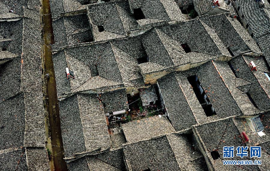 9月13日航拍的晓天老街一角。在安徽省舒城县西南的大别山深处,有一个古老的小镇——晓天镇,其中的老街具有300多年历史,至今古韵犹存,青砖灰瓦、雕梁画栋、古色古香,是皖西地区保存较为完整的徽派古建筑群。老街长700米,宽3米,临街两侧是典型的徽派建筑,高大的马头墙内隐藏着一个个封闭的小世界。老街上,一家家老字号店铺、一扇扇残旧的铺门,构成了一幅幅老街特有的画面。新华社记者 陶明 摄