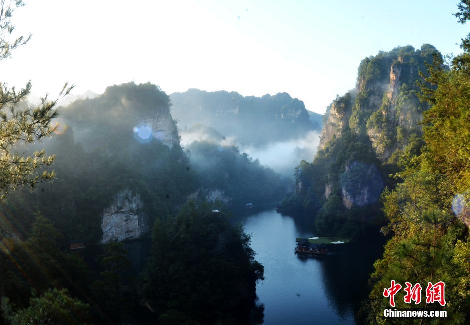 10月8日晨,雨过天晴的湖南张家界武陵源宝峰湖景区薄雾轻绕,船在湖中漫游,宛如一幅壮丽清新的山水画卷。