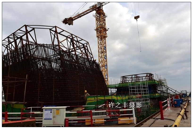 武汉沌口长江公路大桥位于白沙洲大桥和军山大桥之间,是武汉第九座长江大桥,大桥于2014年10月8日开工建设,2017年底建成通车。主桥结构为五跨一联双塔双索面钢箱梁斜拉桥,主跨760米,桥宽46米,为长江上最宽公路大桥。全线采用双向八车道高速公路标准建设,设计时速100公里。图为整整一年来沌口长江公路大桥在长江中心的两座主墩承台从水下施工全面完成转向水上塔柱施工。工人日报-中工网记者许之丰摄影报道2015年10月8日记录于武汉