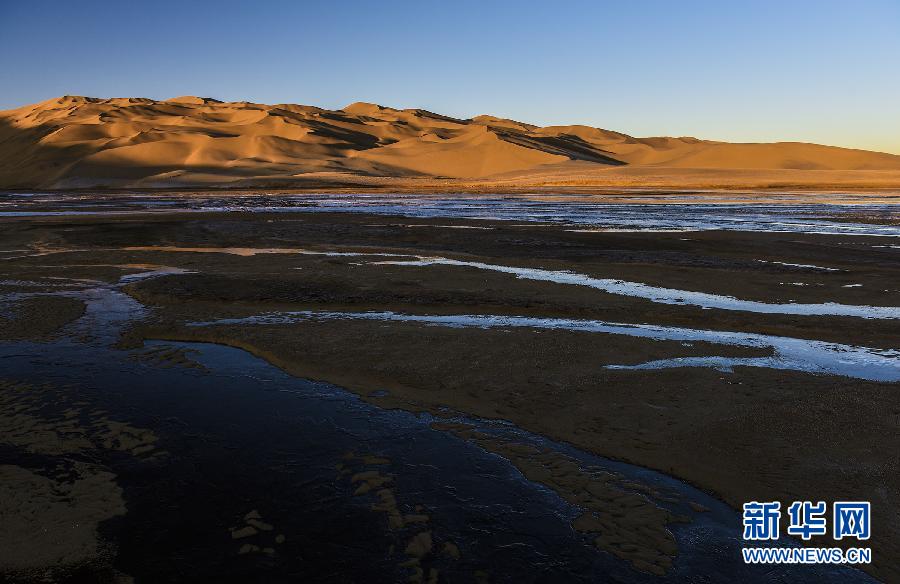 阿尔金山国家级自然保护区的沙山与河流(10月17日摄)。金秋十月,高原天气逐渐转凉,与罗布泊、可可西里和羌塘齐名的中国四大无人区之一——阿尔金山国家级自然保护区进入了一年中较为适合进入的季节。新华社发 (李杨)摄