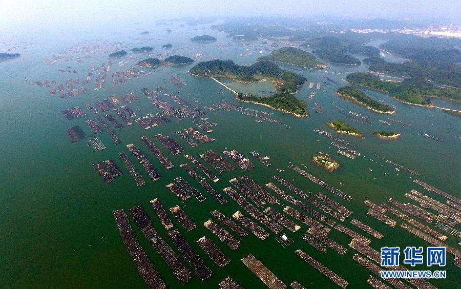 龙门七十二泾大蚝浮筏生态养殖示范区位于广西钦州市茅尾海海域内,得天独厚的咸淡水资源为大蚝育苗提供了绝佳的自然环境,被农业部授予首批“水产健康养殖示范区”。在养殖区,养殖户用于养殖生蚝的架子绵延十里,蔚为壮观。钦州是中国著名的蚝苗培育和大蚝生产基地,素有“中国大蚝之乡”的美誉。全国70%的蚝苗产自于钦州,大蚝养殖面积15万亩,产量20万吨,居全国第一。全市有超过3000户养殖户从事蚝苗培育和大蚝养殖,近年来,大蚝养殖已成为农民增收致富的重要来源。新华社记者 黄孝邦 摄