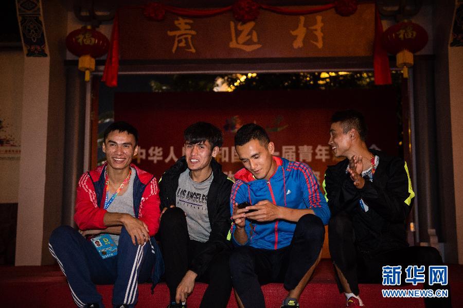 10月22日晚上,四名来自乌鲁木齐的田径运动员在青运村内交流。新华社记者李响摄